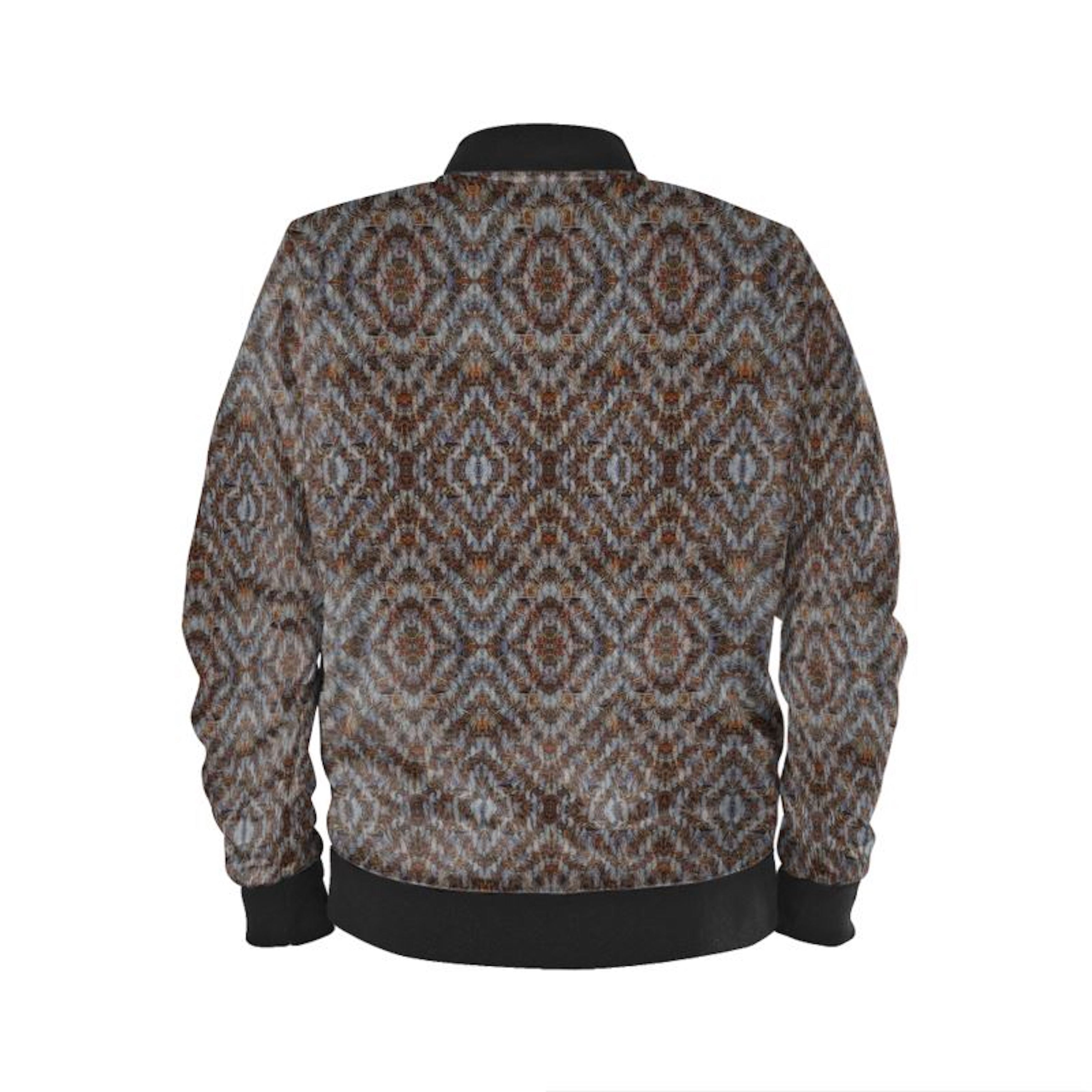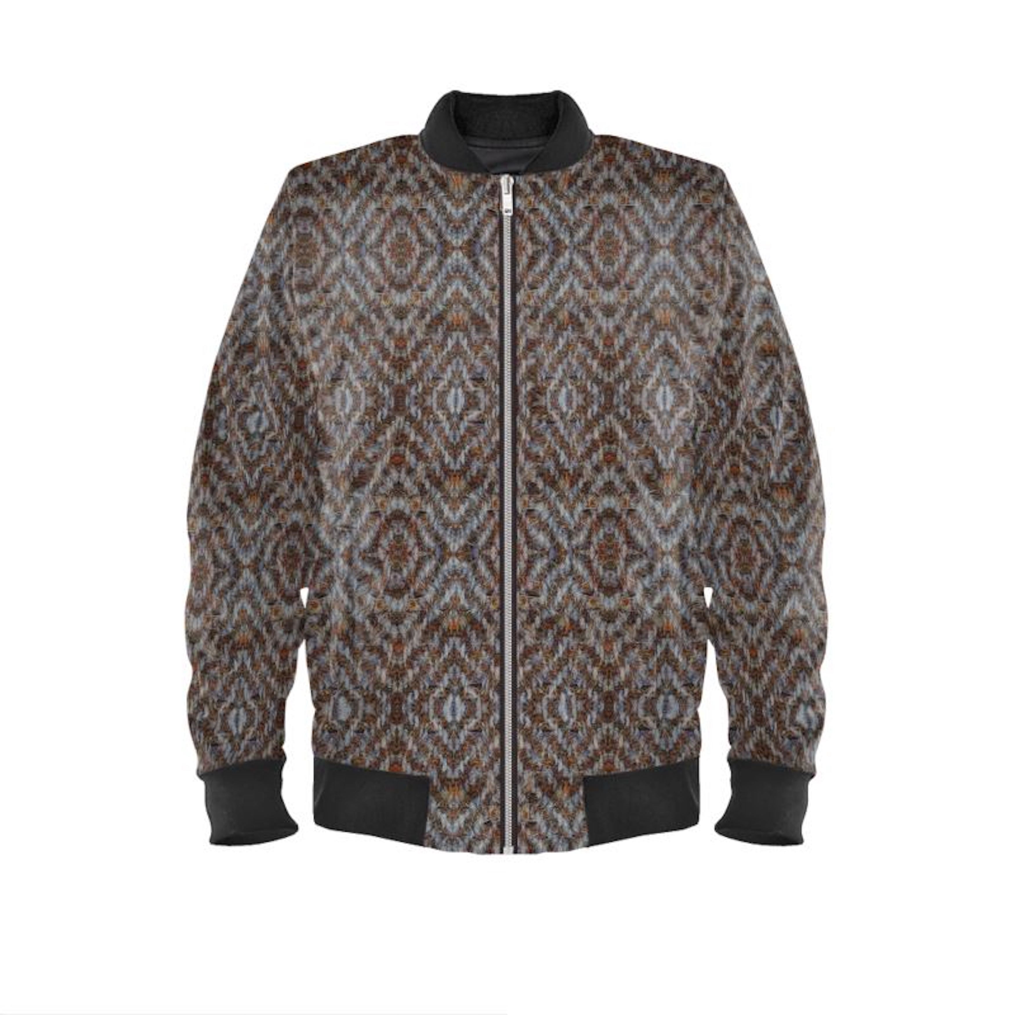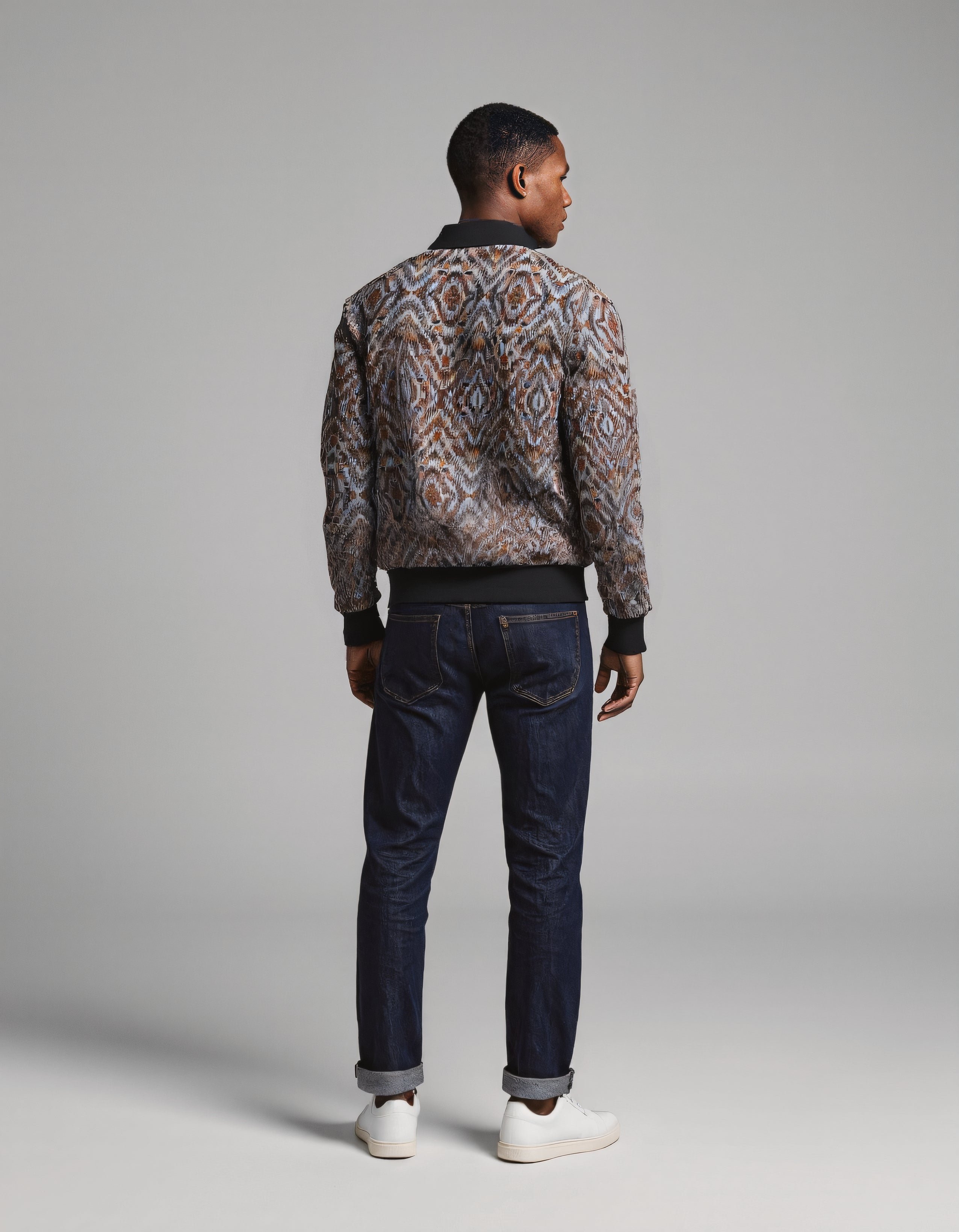 Zip-front bomber cut to a streamlined silhouette, crafted from a tweed printed shell with a fluid drape; finished with contrast rib-knit collar, cuffs and hem, neat topstitching, and discreet pockets for a clean, refined look.