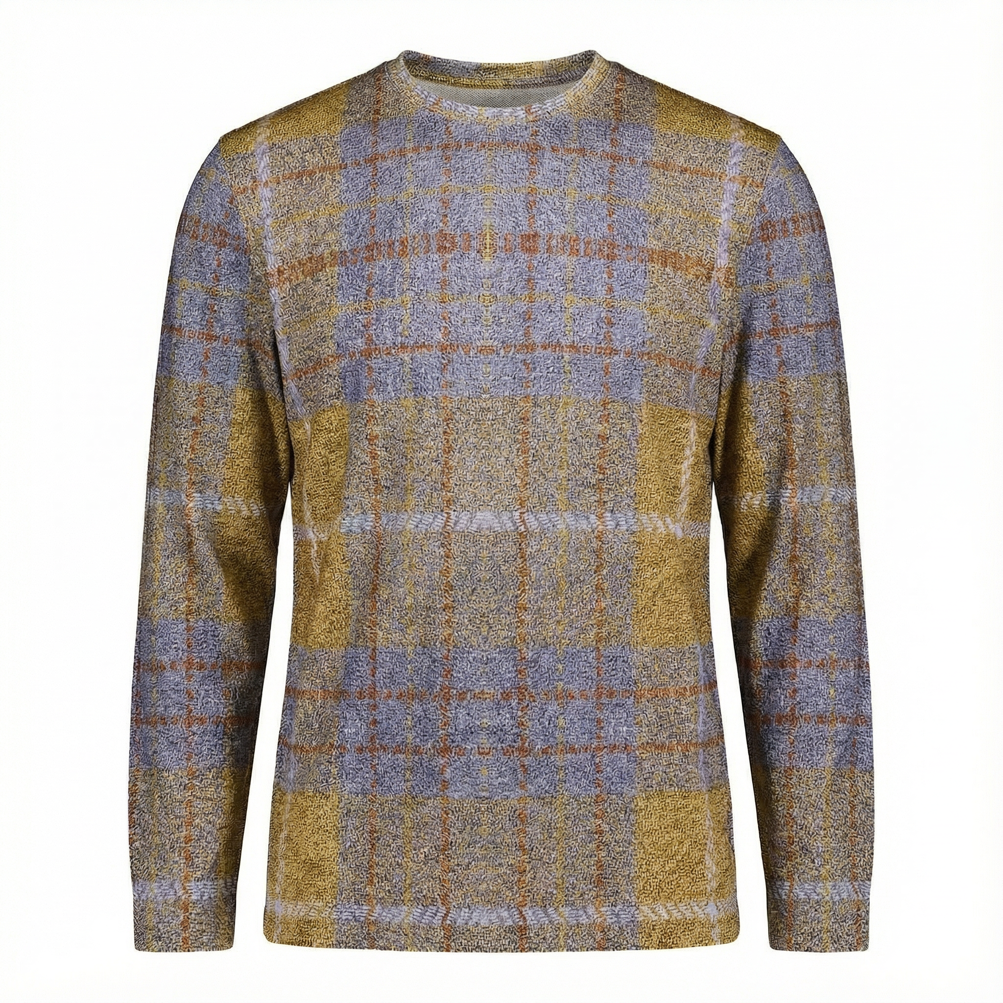 The Lightweight Sweater in classic plaid with warm hues of mustard and soft blue. Made from breathable warm jersey fabric.