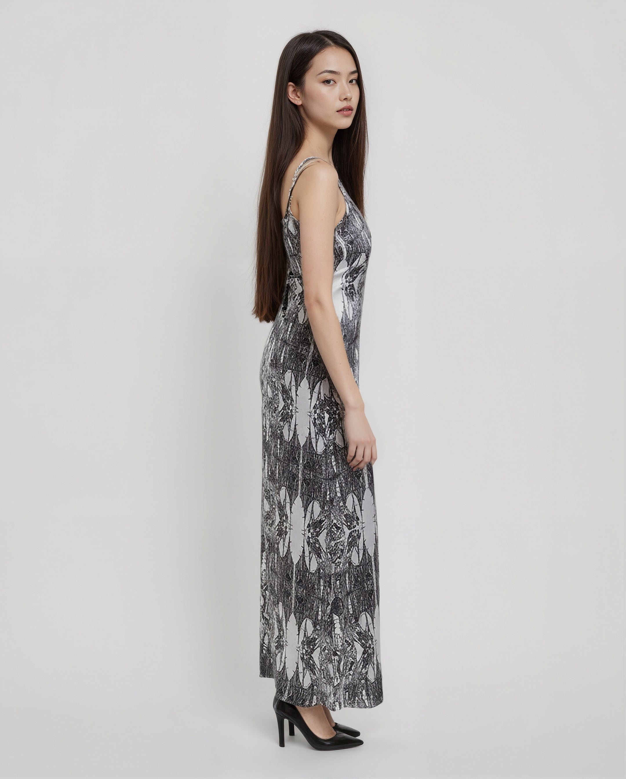 Draped in black tones and an artistic print, it flows effortlessly with delicate spaghetti straps and a sharp V-neckline.